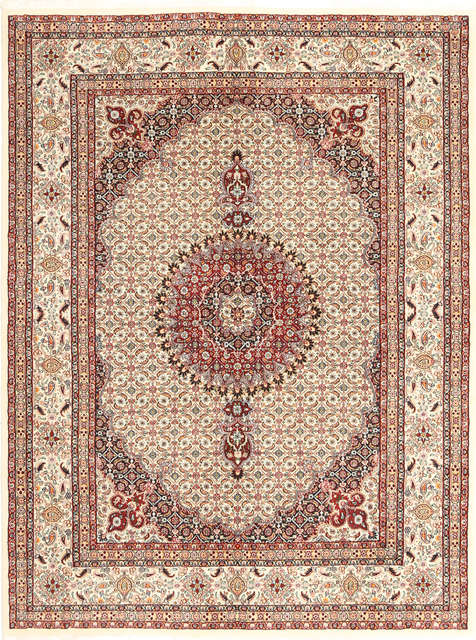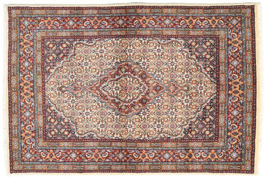 The carpets from moud often have the herati pattern. The area is exceptional for regularly weaving square carpets of 2m x 2m only moud kerman and abadeh make this size frequently. The carpets from moud often have a herati pattern with or without a centrally placed medallion they are sometimes divided into moud mahi and moud garden the first one mentioned mahi often has a beige colour with a light red or blue nuance and a star shaped medallion. This persian moud rugs rug has been crafted with a knot density of 360000 square inch.